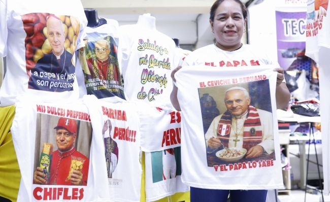 A menos de 24 horas de su elección, confeccionan miles de polos con la imagen del pontífice luciendo la camiseta de la selección, comiendo ceviche o sosteniendo un king kong: pero los que más se venden son los que llevan la frase: “Un saludo a mi querida diócesis de Chiclayo…”