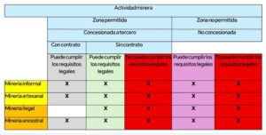 Se debe tener claro que las actividades mineras en una zona permitida pueden ser informales, pero en una zona prohibida como son: las riberas de los ríos, lagunas, cabeceras de cuenca, áreas naturales protegidas o parques nacionales, incluyendo las zonas de amortiguamiento son ilegales.